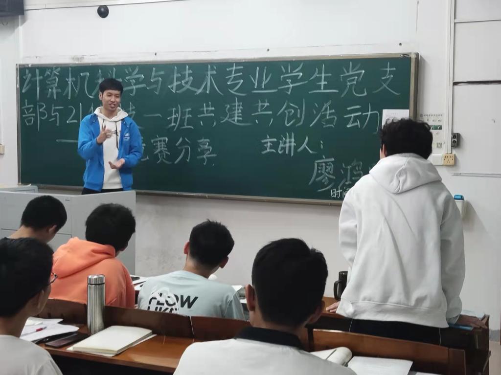 2021年11月28日晚7点,在第一教学楼207展开了党团共建活动的第一次学科竞赛分享,主讲人为19科技一班员工党员廖鸿鹏。