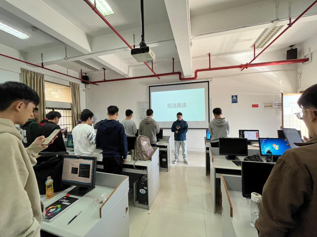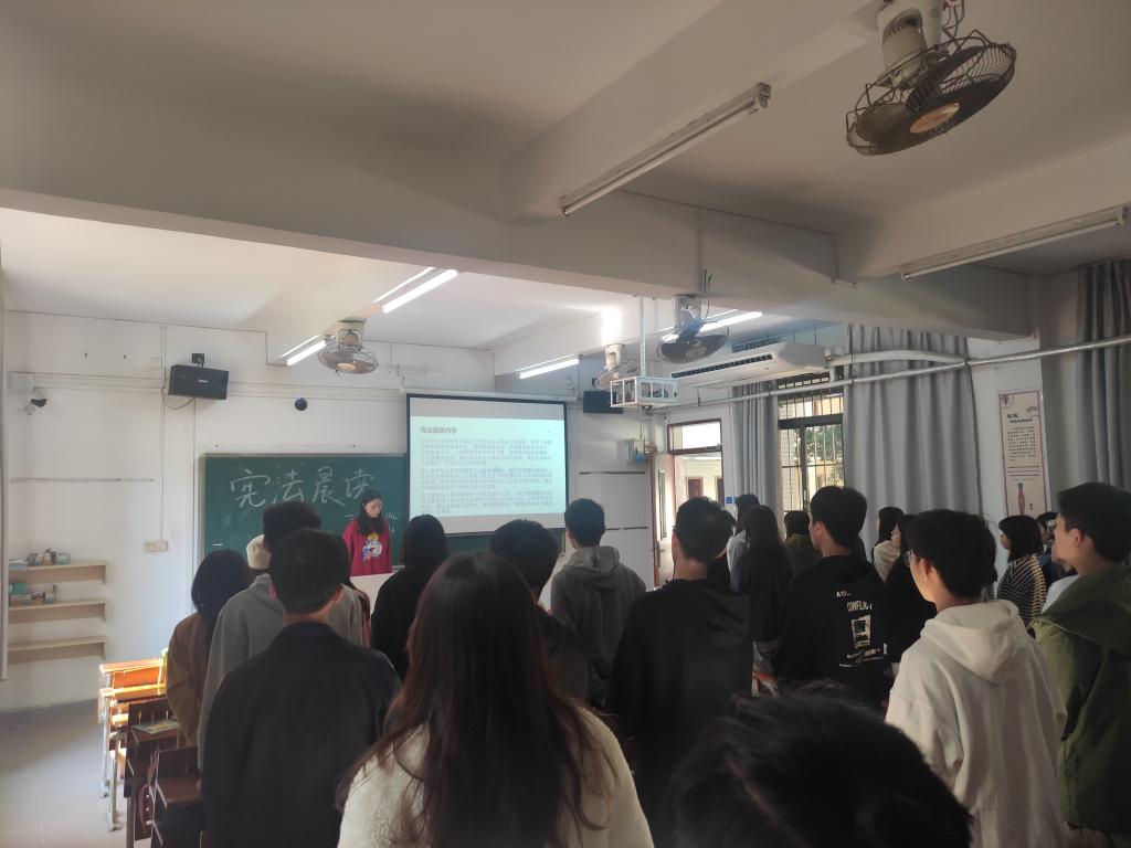 在晨读活动中,同学们精神抖擞地坐在教室里齐声朗读宪法。通过本次朗读,增强了同学们对宪法的理解,体现了宪法的尊严,展现了法员工的法学素质与对法律的信仰。